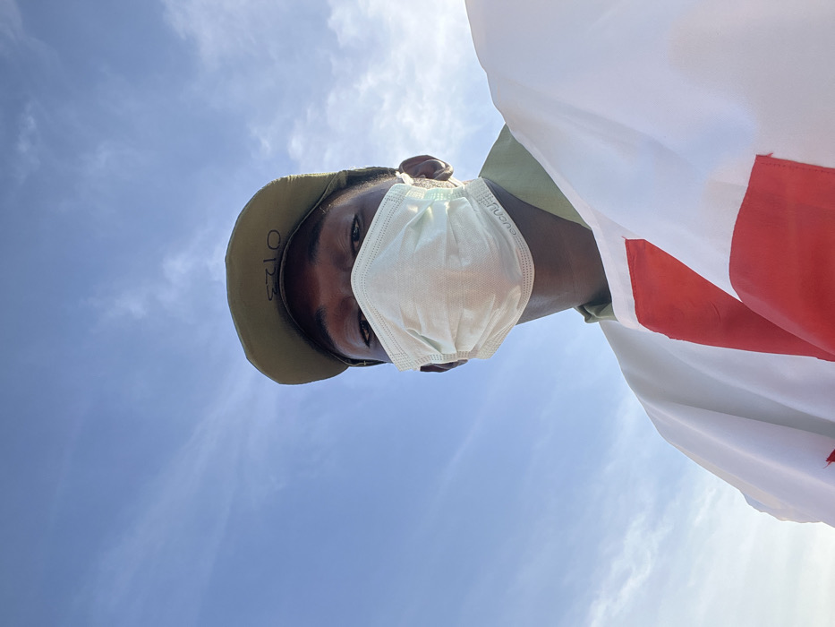 An individual is depicted in a close-up, low-angle shot, outdoors in Maiduguri, Nigeria, under a bright blue sky with sparse, wispy clouds. The subject, a person with dark skin, wears an olive green baseball cap with the numbers "0123" printed in black on the brim. A light green disposable surgical face mask covers their nose and mouth, with the text "euong" or similar visible on the left side. Their dark eyes are visible above the mask, looking directly towards the camera. Over an olive green or khaki collared shirt, they wear a white garment or vest featuring a prominent red cross symbol on the front, indicating affiliation with a humanitarian organization such as the Red Cross. The interaction is a direct gaze at the viewer.