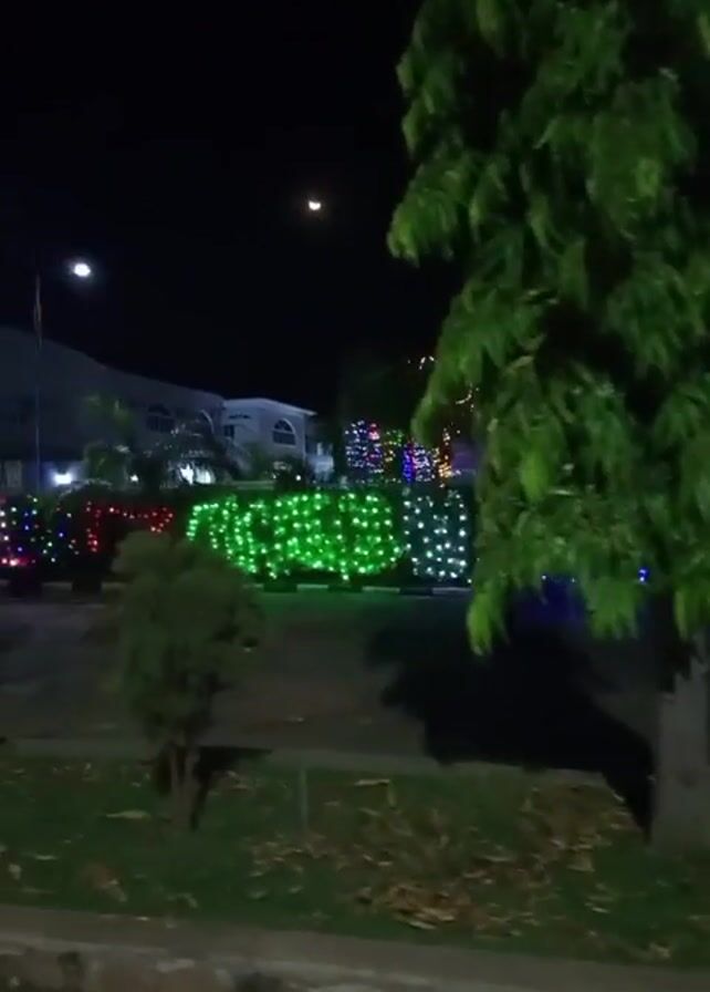 nighttime scene with Christmas lights decorating a lawn. A tree is in the foreground on the right. The lights are arranged in rows of red, green, white, and blue. There is a building in the background. A streetlamp is visible, and the moon is a crescent. The video is shaky.
