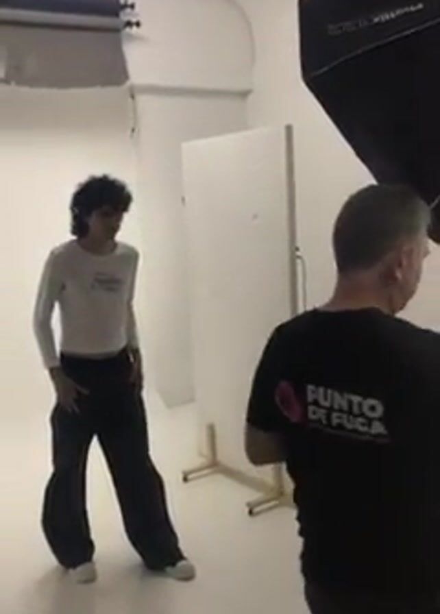The video captures a scene within a white photography studio. A young individual with curly hair, wearing a long-sleeved white shirt and baggy black pants, stands with hands in their pockets. They turn to face the camera briefly. A photographer, wearing a black t-shirt, stands near a large studio light with a black rectangular diffuser. A freestanding white panel stands between the model and the photographer.