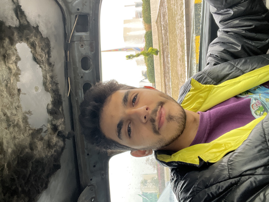 A young adult male, with dark hair, a short beard, and a mustache, is depicted in a selfie, looking directly at the camera with a subtle smile. He is wearing a black puffer jacket with a prominent yellow inner lining at the collar and a purple long-sleeved shirt underneath featuring a graphic design. He is seated inside a vehicle where the ceiling headliner is extensively damaged or missing, revealing gray insulation material and the vehicle's internal structural frame, including visible wires. Through the vehicle's window, which shows water droplets, an exterior scene is visible under overcast conditions. This scene includes wet ground, a curb marked with yellow and black, a distinctly spiral-shaped green topiary bush, and several large, light-colored buildings in the background. A flagpole displaying a flag and another colorful structure are also present. The location is Al-Muhajerin Municipality, Syria.