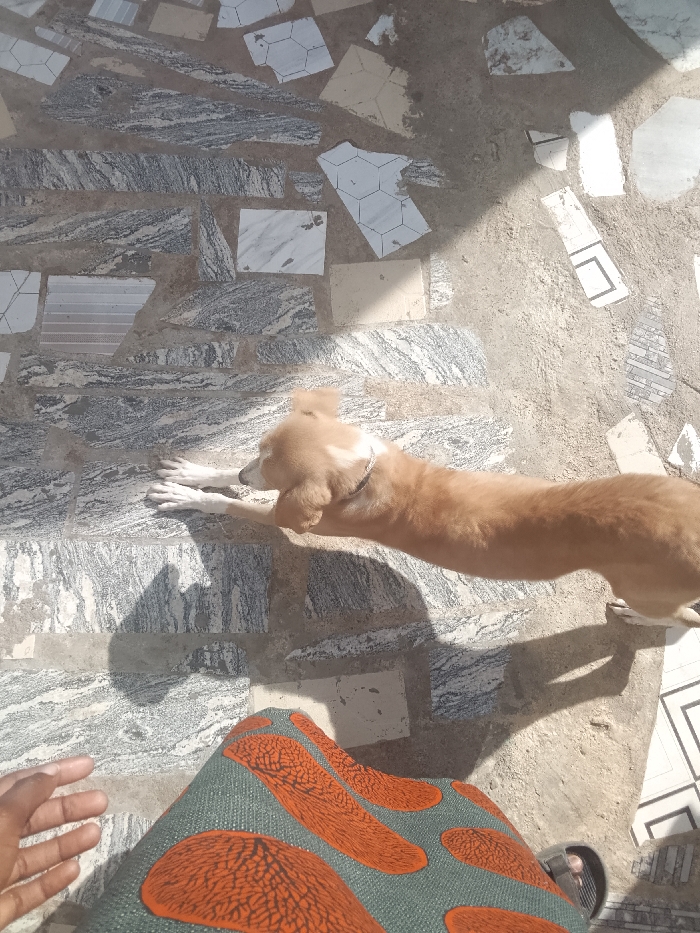 The scene is set on a tiled outdoor or brightly lit indoor floor in Barakin Angundi, Nigeria. A light brown dog with a silver collar is stretching, extending its front paws forward on the variegated mosaic surface. The floor features irregularly shaped tiles of grey veined marble, plain off-white, white with hexagonal patterns, and white with linear stripes, embedded in light grey concrete. Strong sunlight casts distinct shadows, including that of the dog. In the foreground, a human hand with dark skin is visible on the lower-left, next to a green fabric-covered object patterned with textured orange shapes. A human foot in a dark slipper is partially visible on the lower-right, adjacent to the same fabric object.