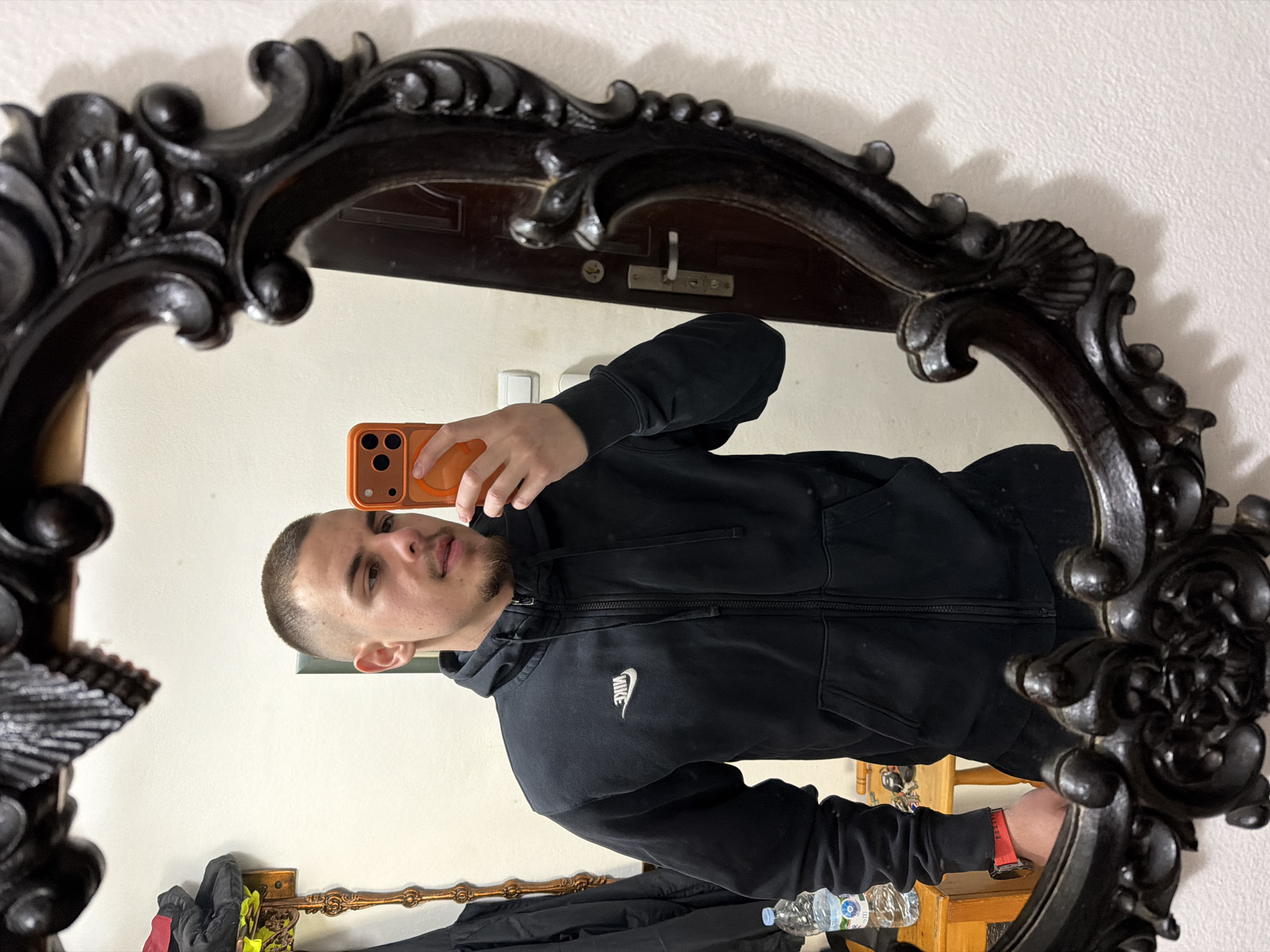 A person with a close-cropped haircut is taking a selfie in a mirror with an ornate black frame. The person is wearing a black Nike hoodie. Reflected in the mirror is a light-colored wall, a section of a wooden cabinet with water bottles on it, and a partially visible black garment. The location, Peshtera, Bulgaria, cannot be confirmed from the image.