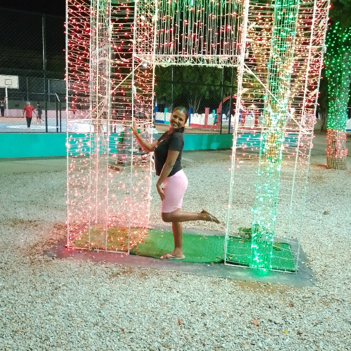 A woman stands barefoot on a small green mat, posing next to a box-like structure illuminated with festive lights. She's wearing a dark t-shirt and pink shorts, one leg bent with her foot slightly raised. The light structure, outlined in white, is adorned with red, green, and clear twinkling lights. Behind her, a dimly lit park area with a basketball court is visible. The ground around the structure is covered in small, light-colored pebbles.