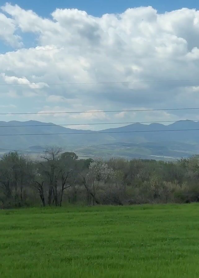 landscape with green fields, trees, mountains in the distance, and a blue sky with white clouds. Power lines are visible, and the camera appears to be moving. The trees in the foreground are mostly bare, with some early signs of spring.