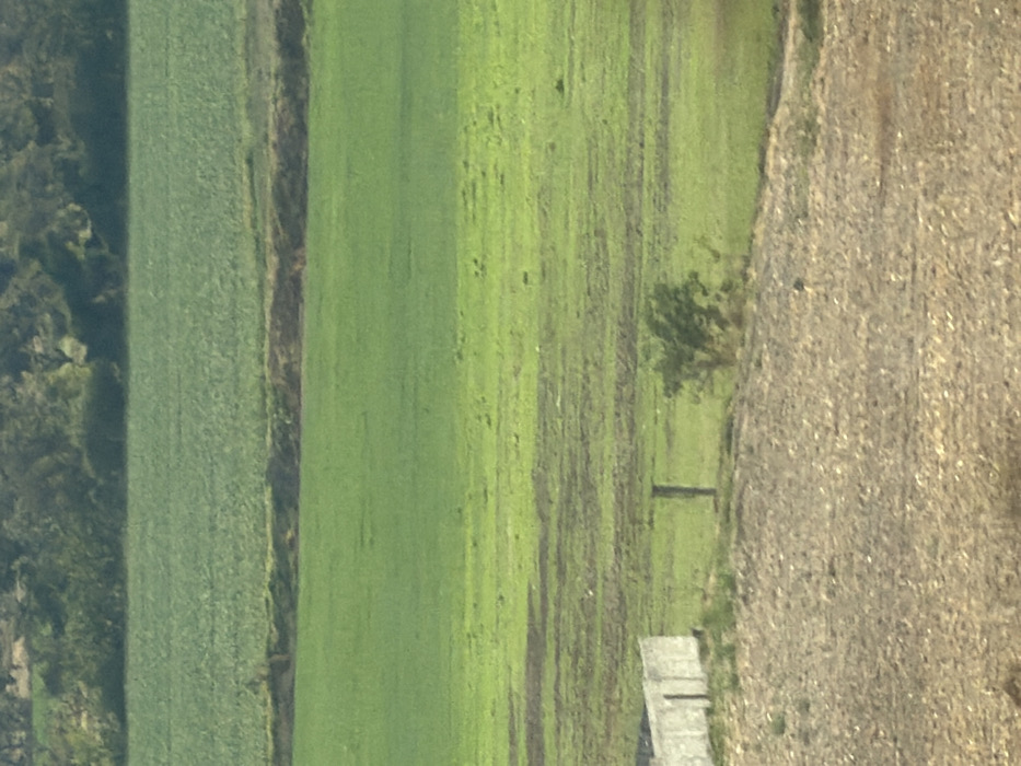 The image presents a landscape with distinct sections. On the left, lush green vegetation borders a strip of dry land. Moving towards the center, a vibrant green field extends, marked with subtle lines. A small tree stands out within this field. To the right, a contrasting dry, textured area fills the frame, possibly harvested land. A wooden structure is visible at the bottom right of the image.
