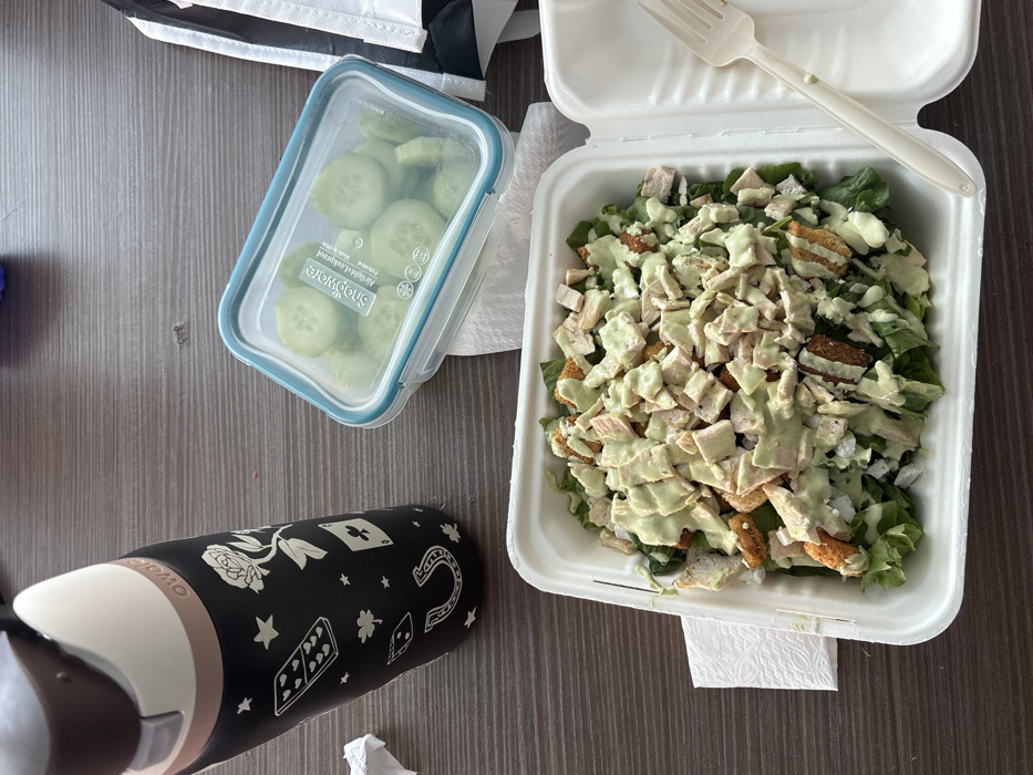 A container of sliced cucumbers, a salad with cubed chicken and green dressing, and a patterned water bottle sit on a wooden surface. The salad is in a white takeout container with a plastic fork resting on top. The water bottle has a black background with white designs, including dice, a horseshoe, and playing cards. A white tissue is visible near the bottom of the bottle.