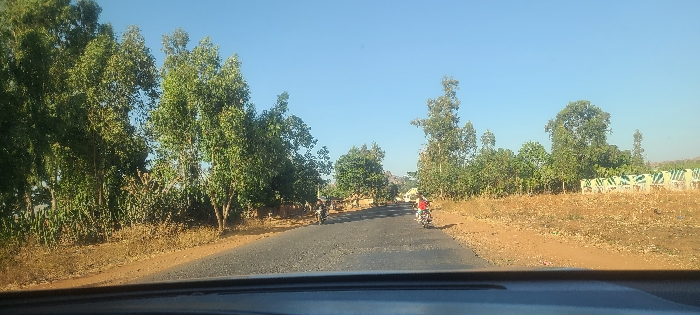 The image captures a straight, worn asphalt road under a clear blue sky, situated in a semi-rural area of Hoss, Nigeria
