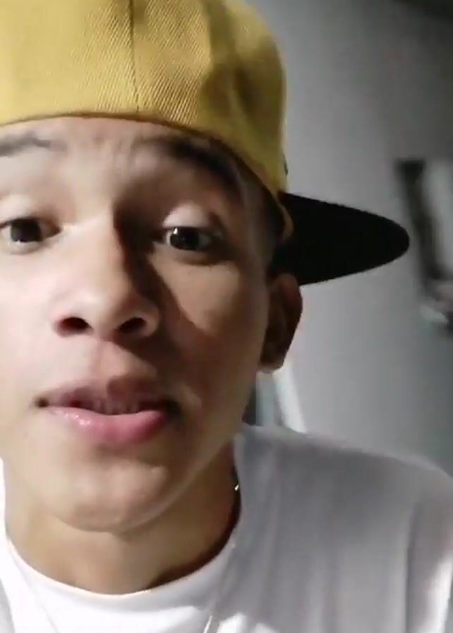young man wearing a yellow baseball cap and a white t-shirt. He is standing on a balcony at night, with city lights visible in the background. He points a finger towards the camera. The man is wearing a necklace with a cross pendant.