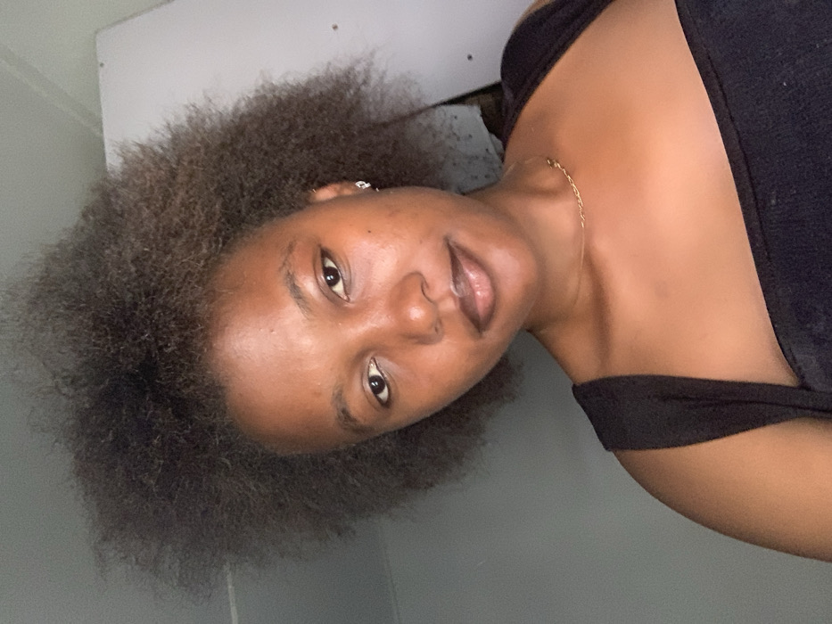 A headshot-style portrait displays a young adult female with dark skin and voluminous, dark, natural afro-textured hair, filling the upper portion of the frame