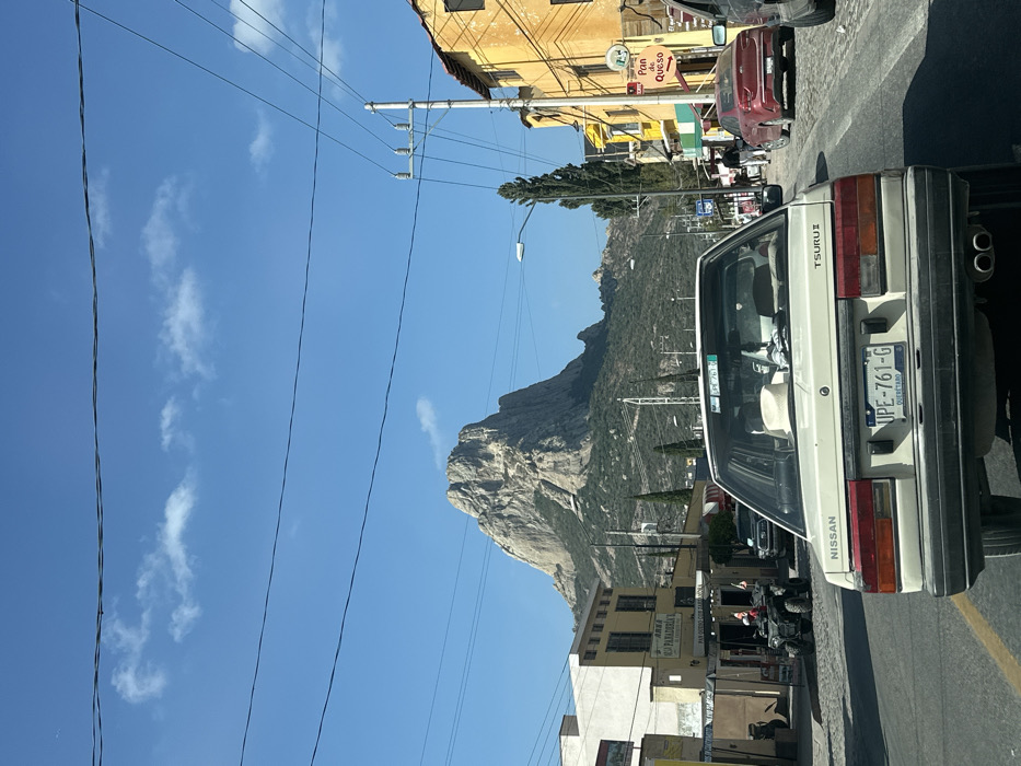 A tan Nissan Tsuru car is parked on a street. Its license plate reads "UPE-761-G". Behind the car is a view of a mountain, power lines, and buildings. A yellow building with a sign in Spanish is visible on the left. The sky is blue with some scattered clouds.