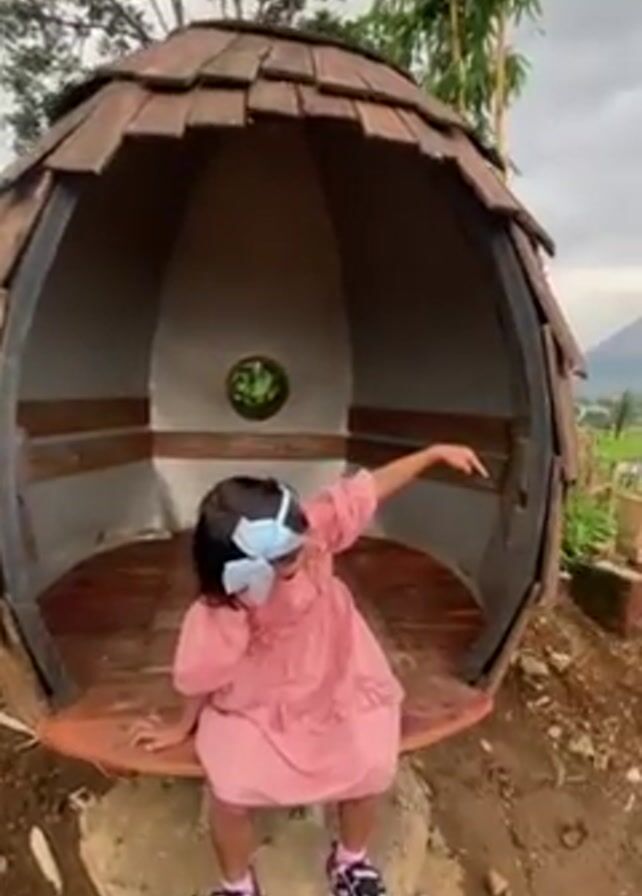 A little girl in a pink dress sits in the entrance to a small wooden structure shaped like a seed pod. The top of the structure is covered in small wooden shingles, and the entrance is rounded. Inside the structure, there are wooden benches and a circular window on the back wall. The girl points to the landscape visible through the structure's opening. The landscape features rice paddies, houses, and two mountains in the distance, partially obscured by clouds. The weather appears overcast.
