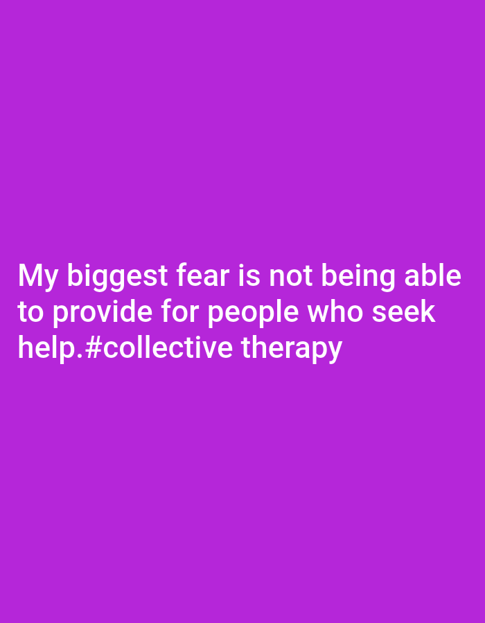 The image displays white text on a solid purple background. The text, in a sans-serif font, is positioned in the lower half of the frame. It reads: "My biggest fear is not being able to provide for people who seek help.#collective therapy". No people, distinct objects, or specific actions are depicted. The environment is abstract, limited to the textual message and its background. The location is Unknown, Unknown.
