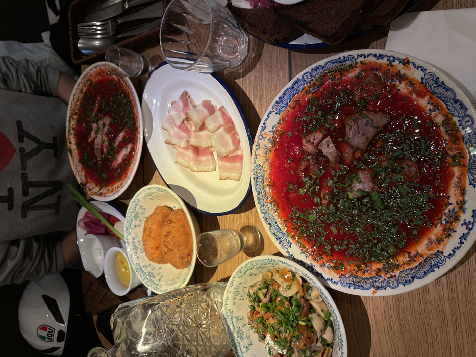 This image depicts an overhead view of a wooden table laden with a meal for multiple individuals in a restaurant setting in Dnipro, Ukraine. One person is partially visible in the upper center, wearing a grey long-sleeved shirt with "I ❤️ NY" printed in black. Their torso and arms are visible above the table surface. The table features numerous dishes: * In the foreground, a large, round white plate with a blue patterned rim holds a deep red, liquid-based dish containing chunks of meat and heavily garnished with chopped green herbs, resembling borscht. * Another similar round plate further back contains an identical red dish with meat slices and green herbs. * To the left of the foreground dish, a white bowl with a blue patterned rim contains a salad composed of light-colored mushrooms, possibly pickled, mixed with green onions and other herbs. * An oval white plate with a blue rim displays several slices of raw *salo* (cured pork fat). * A white bowl with a blue patterned rim holds two golden-brown, oval-shaped fried items. * Small white bowls contain yellow mustard and white sour cream. * A small plate holds fresh green onions and sliced red radishes. * Several slices of dark rye bread are present, some resting on a white napkin. Drinkware includes a large, clear, textured glass carafe, two small clear shot glasses (one empty, one with a clear liquid), and two larger clear drinking glasses. A white motorcycle helmet with an AGV logo is positioned on the table to the left of the partially visible person. In the upper right, a dark woven basket contains a selection of metal silverware (forks and knives). The overall scene indicates a traditional Ukrainian dining experience.