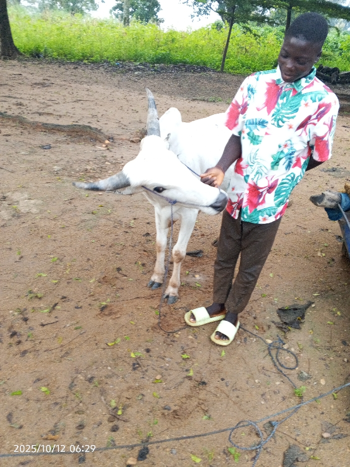 On 2025/10/12 at 06:29, an outdoor scene in Kamantan, Nigeria, depicts a young male and a white Zebu-type bull