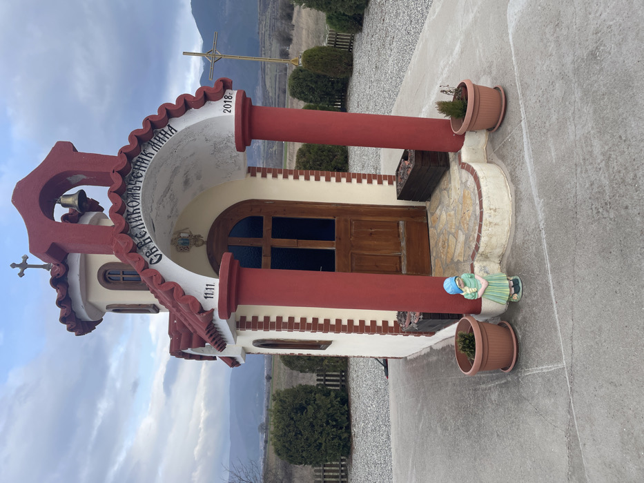 The scene captures a small, cream-colored, single-story chapel-like structure situated on a concrete pad in Krainitsi, Bulgaria