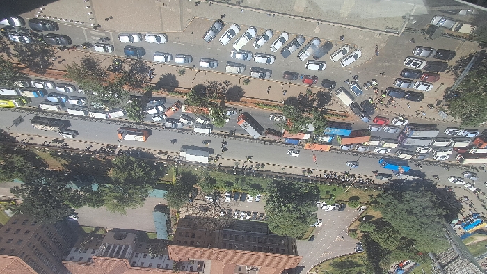 This image depicts a high-angle view of a busy urban scene in Nairobi, Kenya, specifically the area around the Parliament Building