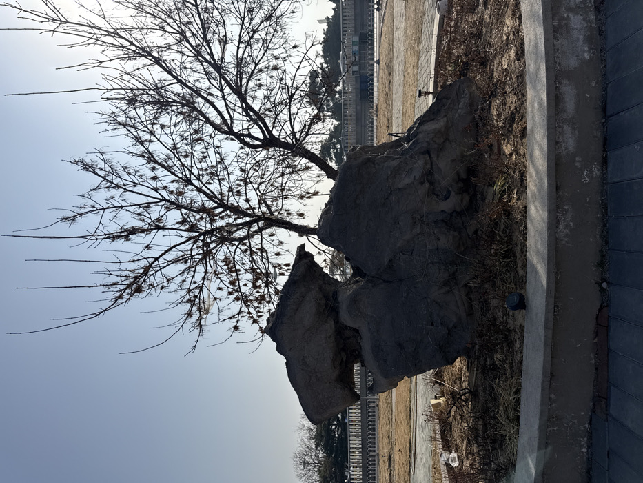 The image displays an outdoor landscaped area within Chaoyang District, Beijing, China, under a clear, bright sky. The central elements are a large, irregularly shaped dark gray rock formation and a bare deciduous tree. The multi-component rock formation is positioned within a raised planter bed with a concrete curb. The tree, characterized by numerous fine, leafless branches and scattered dark brown seed pods or withered foliage, grows directly behind and partially entwined with the rock, its silhouette prominent against the bright sky. The planter bed contains dry, sparse vegetation and a single small, black solar-powered garden light near the base of the rock on the left. The foreground consists of a dark paved walkway made of rectangular blocks. In the midground, a wide expanse of dry, yellowish-brown ground, likely dormant grass or earth, is visible, crisscrossed by paved paths. The background on the left features a long, low-rise building with a repeating series of arches or columns. To the right, an ornate light-colored railing or bridge structure spans horizontally across the scene. No individuals are present in the depicted scene.