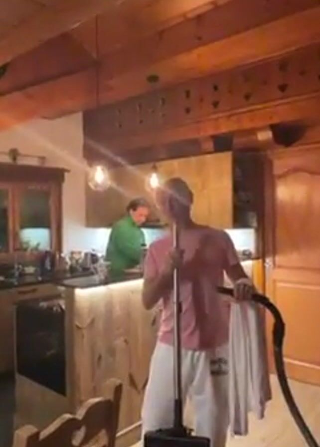 man holding the wand of a vacuum cleaner like a microphone, presumably about to sing or speak. He is wearing a pink t-shirt and white sweatpants. Behind him, another person is visible in the kitchen. The kitchen has wood cabinets and a wooden countertop. There are pendant lights hanging from a wooden ceiling.