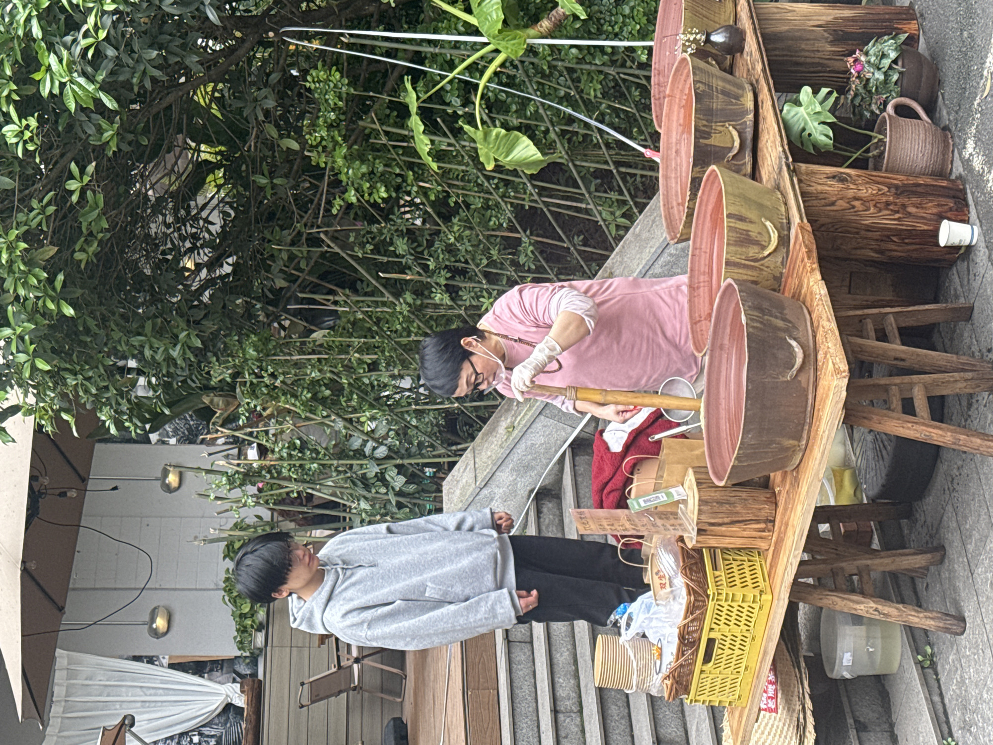 The image depicts an outdoor scene in the Yuzhong District, China, where a vendor is preparing food for a customer. A young man in a grey hoodie and black pants stands to the left, seemingly a customer. The vendor, wearing a pink shirt, glasses, and a face mask, stands behind a wooden boat-like structure that serves as a food stall. The stall is filled with large, brown pots with reddish interiors. The vendor is using a long wooden utensil to interact with one of the pots. The stall also contains a variety of items including paper bags, receipts, a yellow plastic crate, and stacks of plates. The stall is positioned on a set of stone steps. Behind the stall, dense greenery fills the background, including trees and bushes. Above, branches overhang the scene. The lighting suggests it is daytime, with diffused light filtering through the greenery.