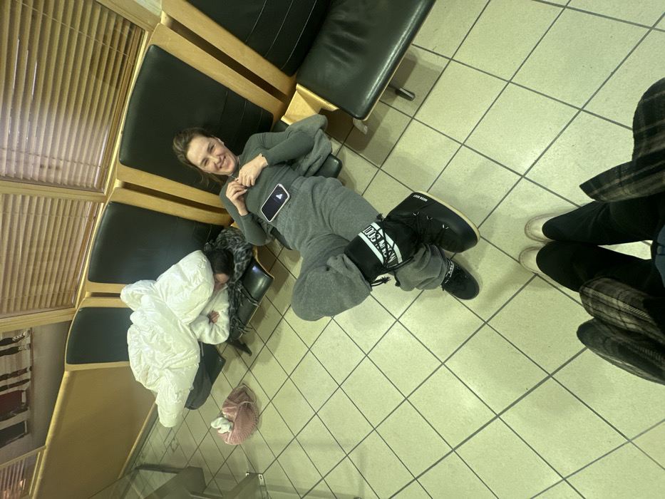 A woman wearing a gray jumpsuit and black Moon Boots lies on the floor next to a row of seats. Her phone rests on her chest as she smiles at the camera. Next to her, another person is seated and bundled in a white coat. A pink knitted item sits on the floor nearby. To the right, a person stands, visible from the knees down, wearing black pants, white shoes, and a plaid jacket. The scene takes place in a waiting area with tile flooring and slatted blinds.