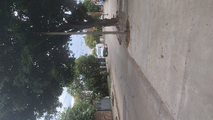 A residential street scene shows a white van parked further down the road. A large, leafy tree dominates the left side of the frame, casting shadows on the road. The street is lined with sidewalks and hints of houses behind the trees. The right side of the image displays a close-up view of the concrete sidewalk, revealing its texture and imperfections.