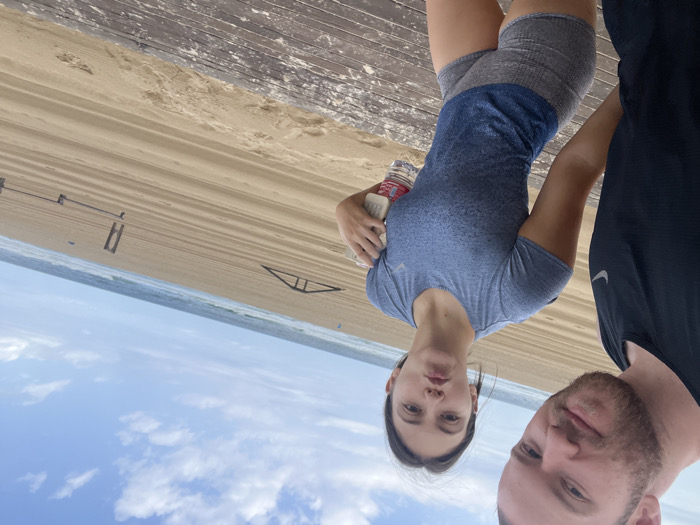 A selfie-style image shows two individuals on a wooden boardwalk next to a wide sandy beach in the city of Unknown, Unknown