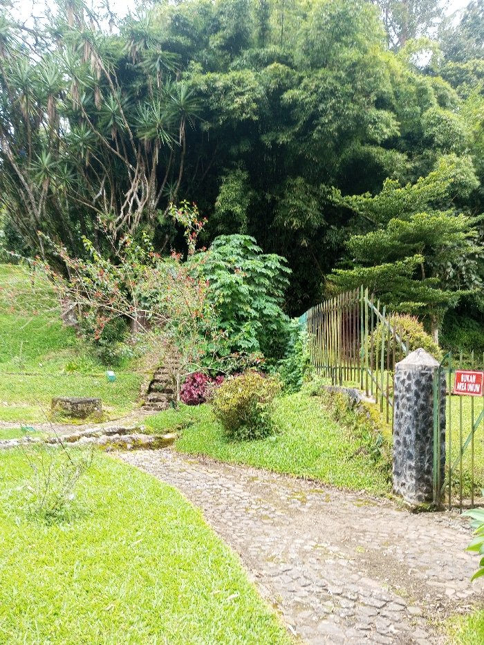 A stone path winds through a lush green landscape. The path leads to a set of stairs and a gate with a sign in a foreign language. Verdant trees and plants, including bamboo and a vibrant red bush, surround the path. A stone structure sits on the left side of the path, adding to the natural scenery. A mossy area indicates a potentially wet or damp environment. The overall scene evokes a serene and secluded natural setting.