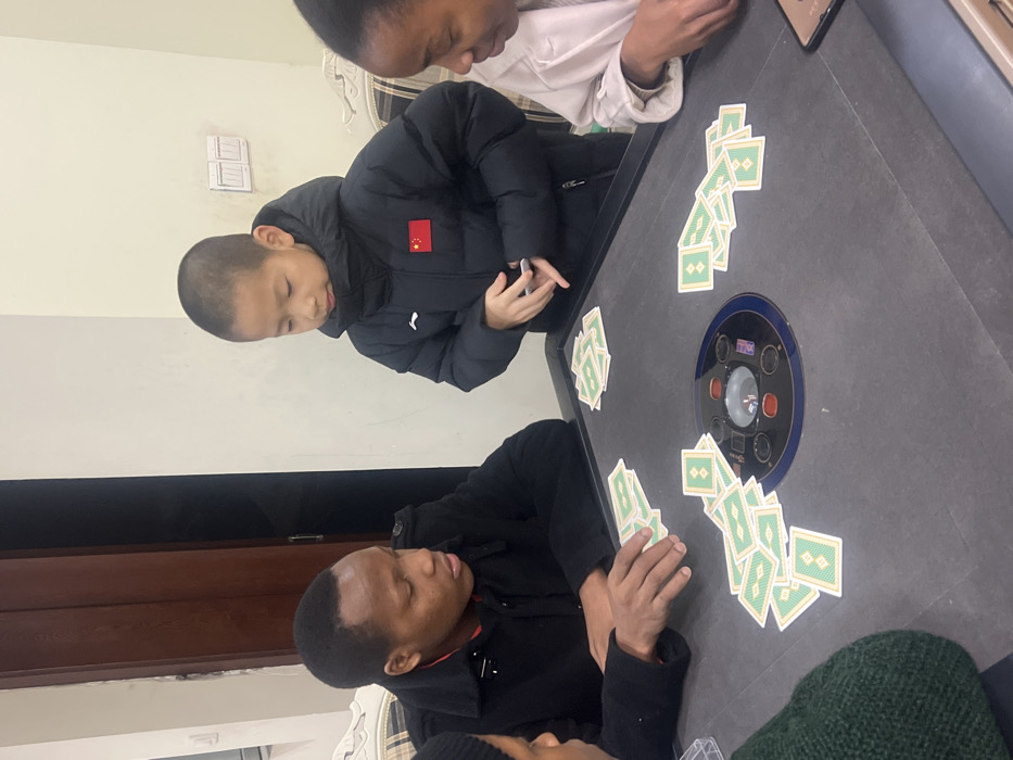 An indoor scene in Banan, China, depicts four individuals gathered around a dark gray table, engaged in a card game