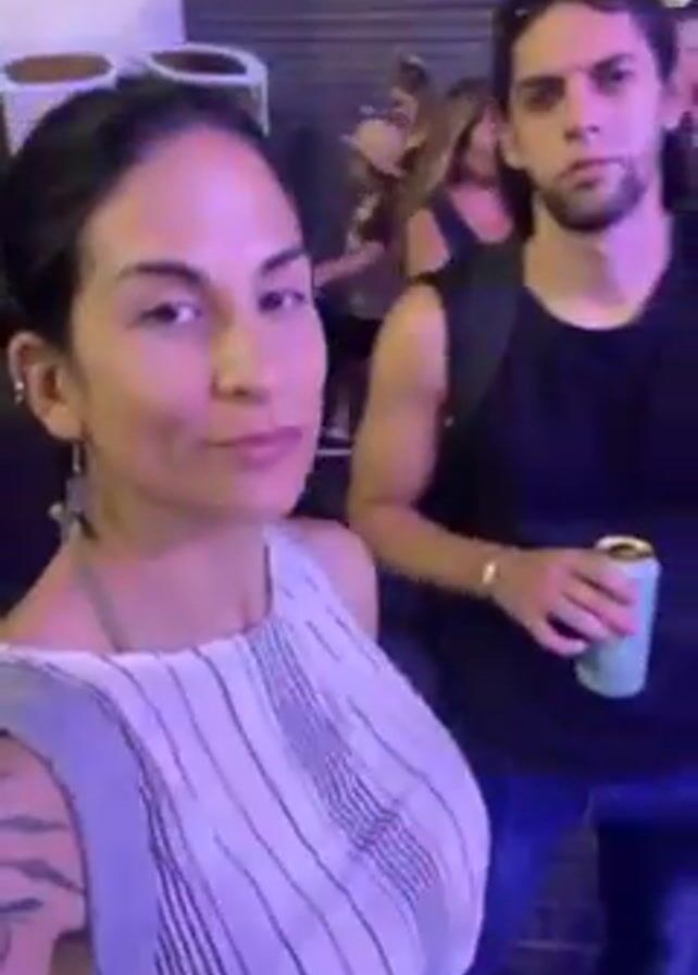 A woman with a tattoo on her left arm and wearing a striped top is holding her phone in front of her, taking a video. She is in a crowded area with purple lighting, with people dancing in the background and a man in a black tank top and backpack standing behind her, holding a beverage can. She puts on light blue sunglasses and raises a peace sign.