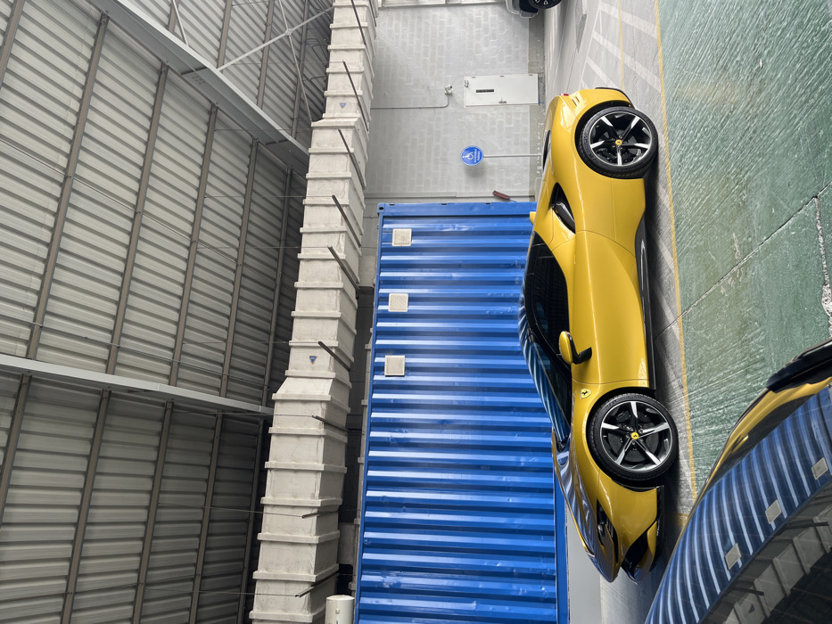 A yellow Ferrari sits on a green-toned surface next to a blue corrugated container. Adjacent to the container is a tall, stacked, concrete ventilation system. A gray corrugated metal wall stretches to the left. Part of a black vehicle is also visible.