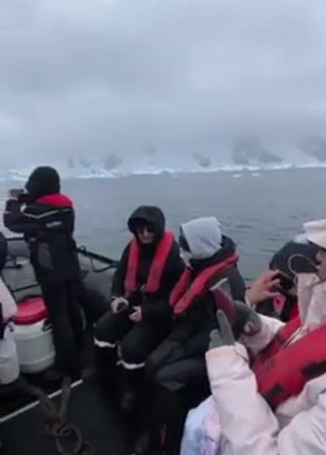 Several people are on an inflatable boat, wearing hooded jackets and life vests, navigating through icy waters under a cloudy sky