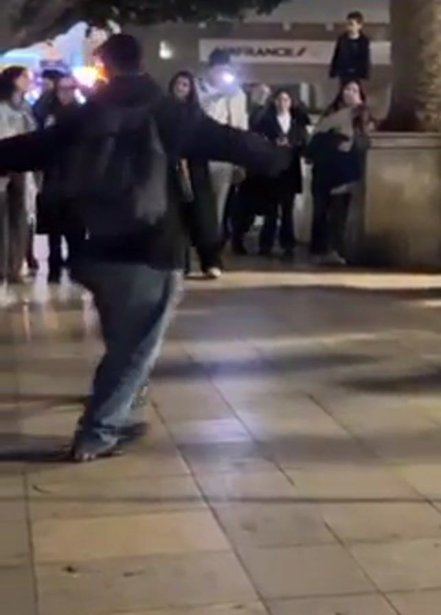 A group of people stand and watch two people dancing outside at night. One of the dancers is an adult male, the other a child. The male wears a backpack and dances facing away from the camera. The child wears a red shirt and dances toward the camera, copying the adult male’s steps. Behind them, the audience watches and smiles. In the background are two lit signs, one with a stylized airplane and the other with the words AIRFRANCE. A tree trunk is visible on the right. The ground is a tiled pedestrian walkway. The overall atmosphere appears relaxed and joyous.