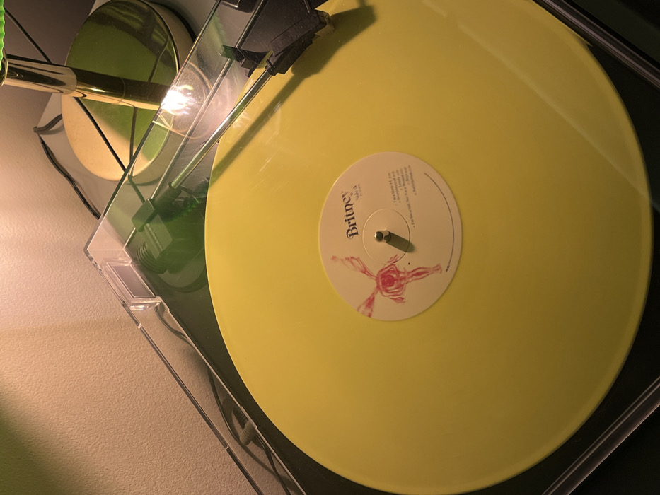 A yellow vinyl record sits on a turntable. The record label reads "Britney" with "Side A" beneath, along with a track list. A stylized pink figure adorns the center. A black tone arm hovers above the record. The turntable has a clear plastic dust cover. A lamp with a gold neck and green shade reflects light nearby.
