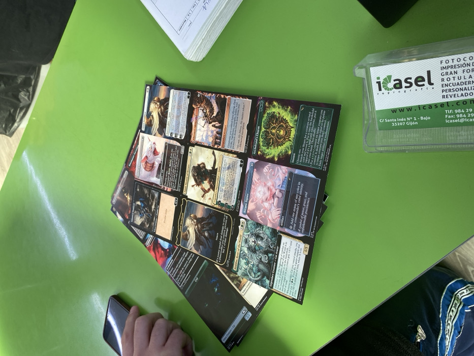 The image depicts an indoor scene on a bright green table. A sheet of uncut Magic: The Gathering trading cards, featuring multiple distinct card designs such as "Archdruid's Charm," "Arcane Signet," and "Arahbo, Roar of the World," lies spread across the left and center. To the upper left, a human left hand, partially visible, holds a black smartphone with a reddish-brown case. On the right side of the table, a stack of white papers is present. In the lower right foreground, a transparent plastic case is visible, bearing a label that reads "icasel," along with the address "C/ Santa Inés No 3 - Bajo, 33207 Gijón," identifying the location as a business named Icasel in Gijón/xixón, Spain. The background shows a blurry dark object, possibly fabric, in the upper right. The lighting appears to be artificial, casting a subtle sheen on the table surface.