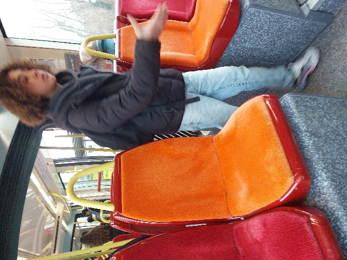 The image displays the interior of a public transit vehicle in Ostwald, France. A young individual, appearing to be an adolescent with curly brown hair, is captured in motion, striding through the vehicle's aisle from left to right. They wear a dark puffer jacket, light blue jeans, and dark athletic shoes with pink accents, and a dark backpack is visible on their back. Their right arm is extended forward with an open hand. The vehicle's interior features rows of cushioned seats upholstered in alternating bright orange and red fabric, each with a red plastic frame and a yellow U-shaped grab handle attached to the backrest. These seats are mounted on a speckled grey base. Yellow grab rails are visible along the ceiling. Through the windows on the right side of the vehicle, blurred outdoor elements including trees and an urban structure are discernible, along with a partially visible yellow sign displaying "20%". Several other passengers are partially visible in the background, mostly out of focus.
