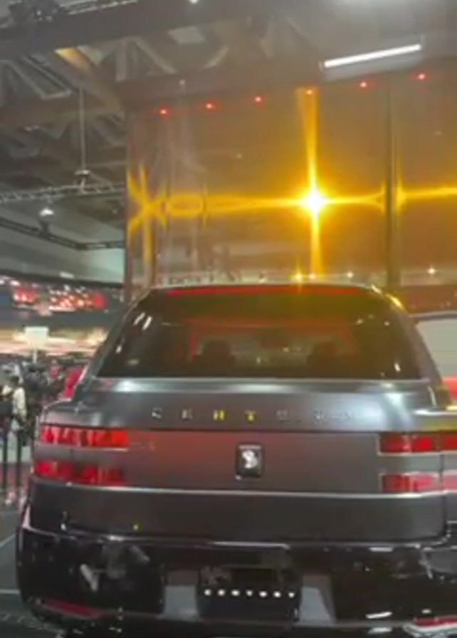 back of a dark gray SUV with the word "CENTURY" written across the back. One of the back doors is open, revealing a red interior. The SUV is on a shiny black platform in what appears to be a convention center or exhibit hall. The background is somewhat blurred, but there are lights and other displays visible. A person in a pink shirt can be seen briefly in the background on the left. The overall lighting is bright, and there is a reflective wall behind the car.