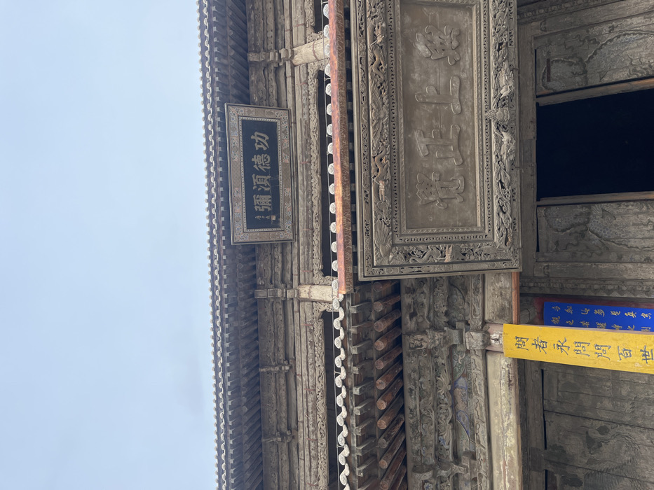 This image presents a detailed, low-angle view of a traditional Chinese Buddhist temple structure, specifically located within the Giant Buddha Temple (大佛寺) complex in Zhangye, Gansu Province, China. The scene is dominated by weathered wooden architecture under an overcast, light blue-grey sky. The primary subject is a multi-tiered building facade featuring intricate carvings and signage. At the upper center, a dark rectangular plaque displays four prominent Chinese characters in gold or yellow: "功德彌陀" (Gōng dé mí tuó), translating to "Amitabha Merit." This plaque is framed by a border of detailed wooden ornamentation. Below the upper plaque, a larger, horizontally oriented plaque, carved from stone or wood, features three deeply incised Chinese characters: "般若上方" (Bō rě shàng fāng), translating to "Prajna Upper Realm" or "Wisdom Upper Level." This plaque is surrounded by elaborate raised relief carvings depicting stylized dragons and intricate floral or cloud patterns. The structure exhibits layered architectural elements including multiple eaves with exposed wooden rafters and light terracotta-colored roof tiles. Stacked wooden beams and bracket sets (dougong-like structures) are extensively carved with mythical creatures, geometric patterns, and botanical motifs. Faint traces of faded polychrome paint are visible in recessed areas of the carvings. To the lower left, two vertical banners are partially visible. The leftmost banner is yellow with black vertical Chinese script, clearly reading "聞者永聞問百世" (Wén zhě yǒng wén wèn bǎi shì), which translates to "Those who hear will forever hear and ask for a hundred generations." A blue banner with vertical text is partially obscured next to it. Below the main "般若上方" plaque, a dark, open doorway indicates an entrance to the building's interior. No individuals are present in the image. The lighting is soft and diffused, typical of an overcast day.