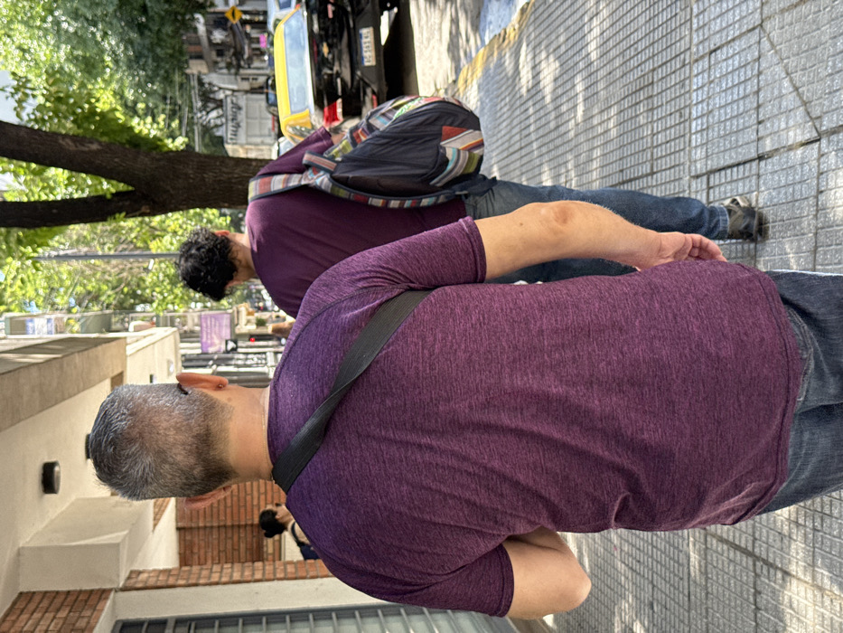 An outdoor, daytime scene depicts an urban street in Buenos Aires, Argentina. The vantage point is from behind two individuals walking away from the camera on a light-colored, gridded tile sidewalk under direct sunlight, casting shadows. In the immediate foreground, a male subject with short, gray hair, exhibiting a fade cut and an earring in his left ear, wears a heathered dark purple short-sleeved t-shirt and blue jeans. A black strap, likely from a bag, crosses his back diagonally from his left shoulder. Ahead of him, a second male subject with dark, curly hair also wears a dark purple short-sleeved t-shirt and blue jeans. He carries a multi-colored sling backpack with vertical stripes (including white, yellow, orange, red, purple, blue, and green) over his right shoulder. To the far left, behind the foreground subject, a partial view of a female individual in dark attire is visible. Further down the street, indistinct figures are present. The street, bordered by a yellow curb line, features a parked black pickup truck with Argentinian license plate "AC 245 MG" (plate number AC 245 MG) on the right side. Behind it, a yellow taxi is partially visible. Additional vehicles line the street in the distance. On the left side of the street, buildings with brick detailing and windows are visible. A tree with a dark trunk and green foliage stands on the right side of the sidewalk, casting shadows. Overhead wires, streetlights, and commercial signs are visible in the background.