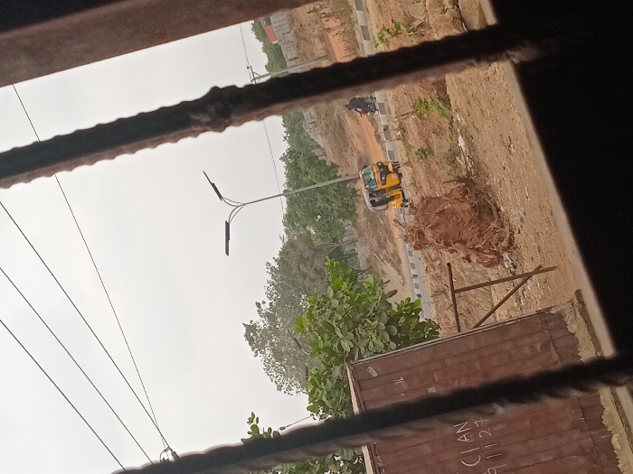 The image captures a street scene in Dam Camp, Nigeria, viewed through blurry, dark brown vertical metal bars in the immediate foreground. To the left, a large, corrugated brown metal structure, resembling a shipping container or kiosk, bears partial white lettering including "CIAN" and "91127." Adjacent to this structure, a prominent mound of reddish-brown earth and root material sits on dry, light brown soil, with a smaller, dark metal frame nearby. A paved road with a black and white striped curb runs horizontally across the mid-ground, where a yellow three-wheeled auto-rickshaw is stationary or moving slowly. Behind the auto-rickshaw, a lone individual on a dark motorcycle is visible. The background features an overcast, light grey sky, numerous green trees and bushes, a street lamp with dual horizontal fixtures (likely solar-powered), and overhead utility lines. Distant light-colored building blocks or structures are present on a slight elevation to the far right.