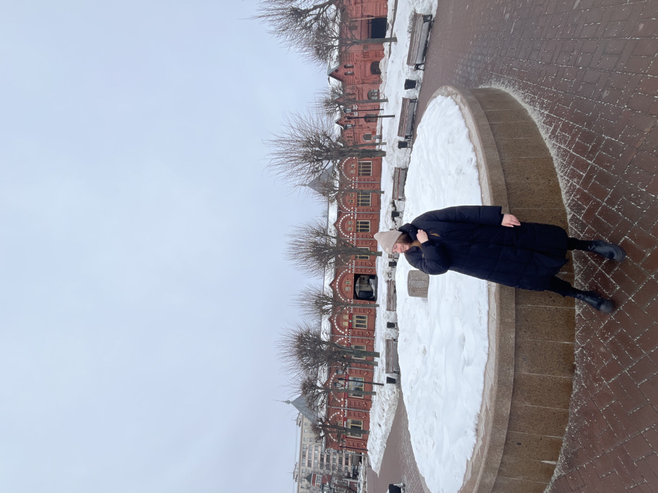 The image depicts a winter scene in Klin, Russia, specifically at the square fronting the historic Trade Rows building. In the foreground, a young adult female stands slightly right of center, leaning against a low, circular stone structure that is heavily covered in snow. She is dressed in a dark, long puffer coat, black pants, black boots, and a light-colored knit beanie. Her head is turned to the left, away from the camera, displaying a subtle smile, with her right hand positioned near her neck, touching her coat collar. The foreground ground is paved with reddish-brown brick, showing patches of snow and ice. The prominent midground features the long, red brick Trade Rows building, characterized by multiple arched windows with white decorative trim, ornate white roof eaves, and several small conical roof elements. Bare, snow-dusted deciduous trees are positioned in front of the building, and multiple vacant park benches are visible amidst the snow-covered areas. Taller, modern residential buildings are present in the distant left background. The sky is uniformly overcast and light gray, indicating diffused natural light.