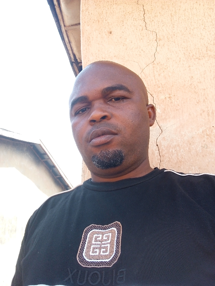 A bald adult male with dark skin and a goatee beard is positioned in a close-up, slightly low-angle shot, looking directly at the camera with a neutral expression. He is wearing a black long-sleeve shirt featuring two thin white stripes on the left shoulder and an embroidered emblem on the chest. The emblem is square, rendered in brown and beige tones with a geometric, interlocking pattern, with the reversed word "BIJOUX" visible beneath it. The background consists of a light-colored, textured wall to the subject's right, showing a prominent vertical crack. To the left and above the subject, a bright, possibly overcast sky or light-colored ceiling is visible, along with a dark, angled roofline or architectural element. The scene is situated in Sabon Tasha, Nigeria.