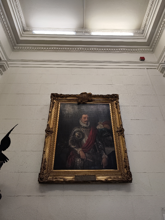 A portrait painting hangs on a light-colored, tiled wall beneath a ceiling with multiple layers of decorative molding and fluorescent lights. The painting is framed in ornate gold and depicts two men in period attire; one in armor with a red sash. A small plaque is positioned at the bottom of the frame. A dark, bird-like sculpture is partially visible on the left side of the image. A red device, possibly a smoke detector, is visible on the upper right of the wall.