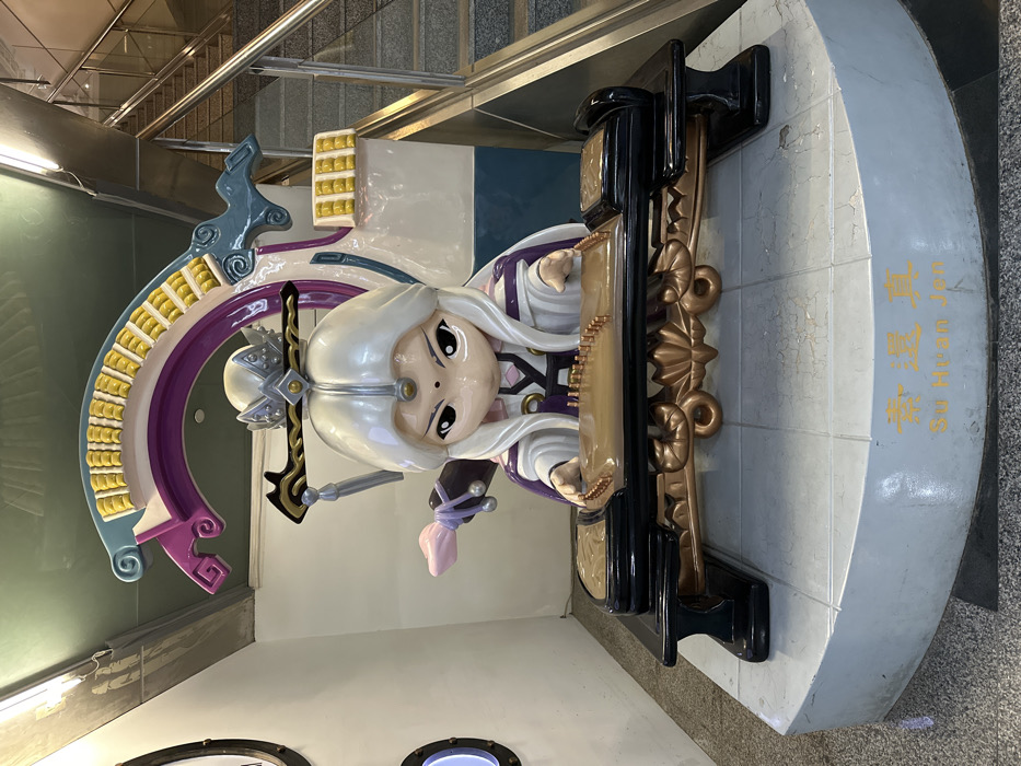 A brightly colored statue of a figure playing a stringed instrument stands inside what appears to be a subway station. The figure has white hair, a sword behind the head, and is wearing purple and white robes. Behind the figure is a decorative arch featuring blue, yellow, and pink colors. Gold lettering can be seen on the base of the statue which appears to be tiled. Metal stairs can be seen in the background.