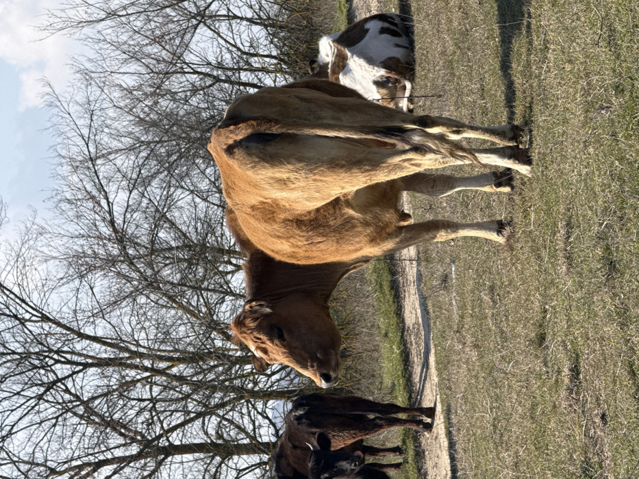 The scene depicts a pastoral landscape in Zdravets, Bulgaria, under a clear to partly cloudy sky. The foreground is a field of dry, sparse green and brown grass. A light-colored dirt path is visible stretching horizontally across the middle ground. The primary subject is a golden-brown cow, standing with its hindquarters oriented towards the viewer. Its head is turned to the left, showing part of its face and a white mark on its forehead. Its tail hangs down, ending with a black brush. Visible between its rear legs are what appear to be testicles, suggesting it is a bull or steer. To the left and slightly behind the main subject, two darker brown cows are visible. One is largely obscured, but its hindquarters and legs are clearly seen on the dirt path. A smaller, black calf with small horns stands directly behind the darker cow. In the right background, a brown and white cow is lying down on the grassy terrain. The background is dominated by a dense cluster of leafless deciduous trees with bare branches, silhouetted against the sky. The overall impression is an outdoor rural setting, possibly in late winter or early spring.