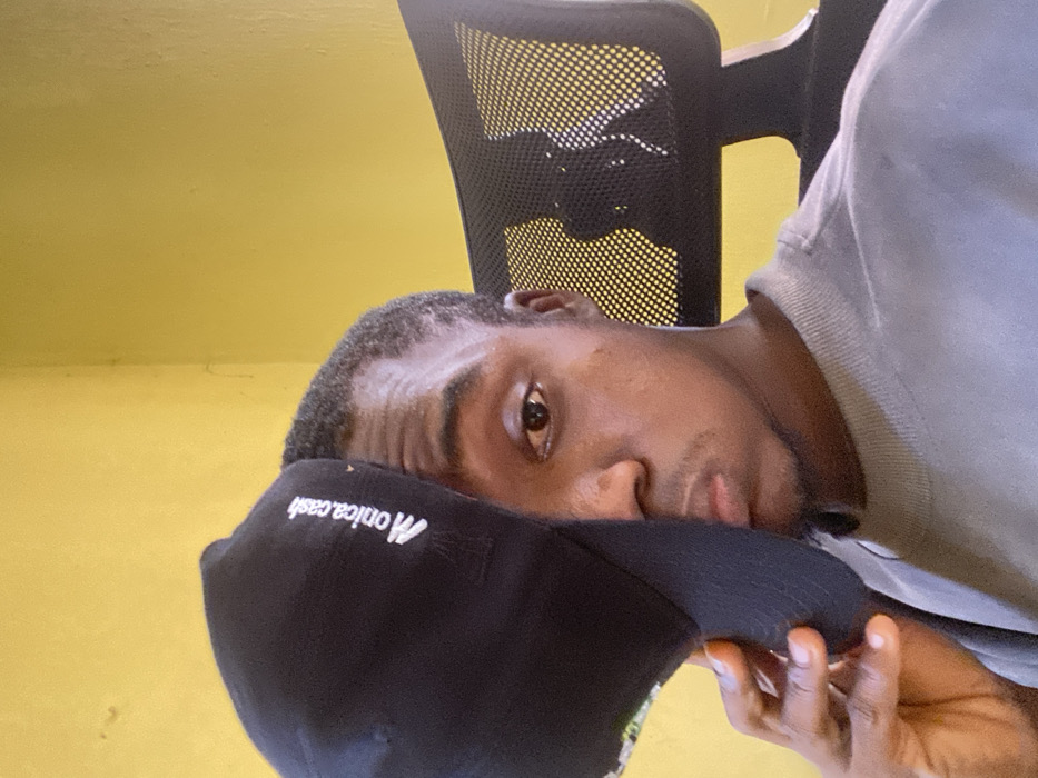 In Egan, Nigeria, a dark-skinned male individual is captured in a close-up shot, seated against a plain yellow wall. The subject wears a light grey long-sleeved top. Their left hand holds a black baseball cap, positioned to obscure the left half of the face. The cap features white embroidered text, "Monica.cash," with a stylized 'M,' visible on its side. The individual's right eye is open and directed forward. A portion of a black office chair with a mesh backrest is visible behind the subject's right shoulder.