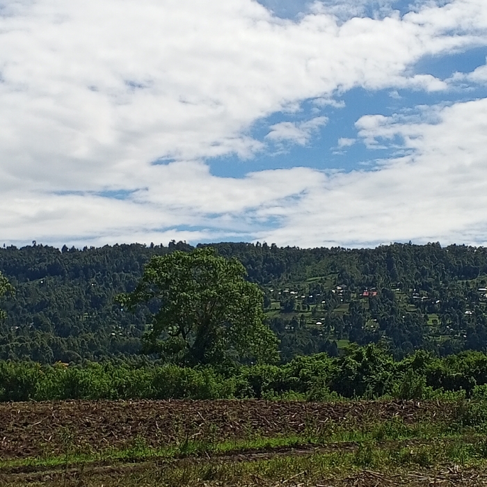 The image displays a rural landscape within Keyian ward, Kenya. The foreground consists of a broad expanse of dark brown, freshly tilled earth, interspersed with some green plant growth and scattered stubble. In the midground, a large, mature tree with a full canopy of green leaves stands prominently. Behind this tree, a dense band of varied green vegetation transitions into the background. The background features a series of heavily forested hills or mountains, uniformly covered in dark green trees. Numerous scattered, predominantly light-colored buildings, consistent with a rural settlement, are visible on the slopes of these hills, with one structure identifiable by a red roof. The sky above is partially overcast with large white cumulus clouds against segments of clear blue sky. No individuals or specific actions are discernible.