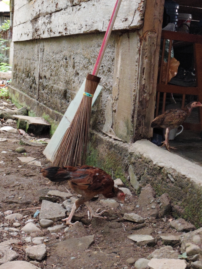 Two chickens roam outdoors. One brown chicken pecks the rocky ground. Behind it, the other chicken stands near a doorway, perched on a ledge above a white mug. A broom leans against a weathered wall next to the doorway. Moss grows on the wall and ledge. The scene is rustic and natural.