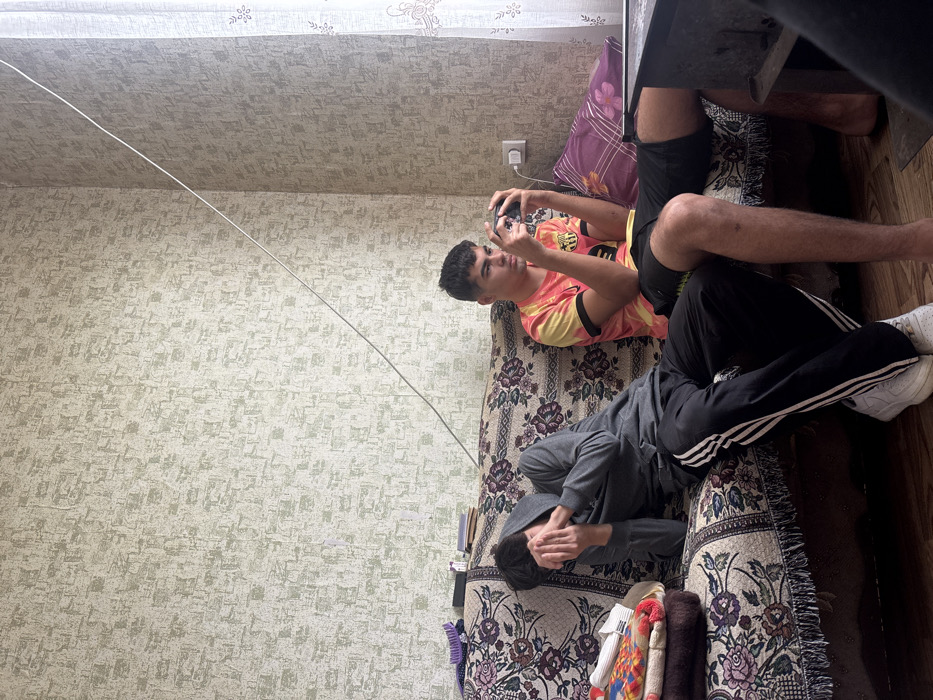 An interior residential scene in Bulishi, Georgia, shows two young males seated on a floral-patterned sofa