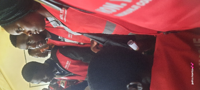 The image captures a group of approximately five young adults gathered indoors, likely within a large tent or temporary structure, situated in the Kamukunji Constituency of Nairobi, Kenya