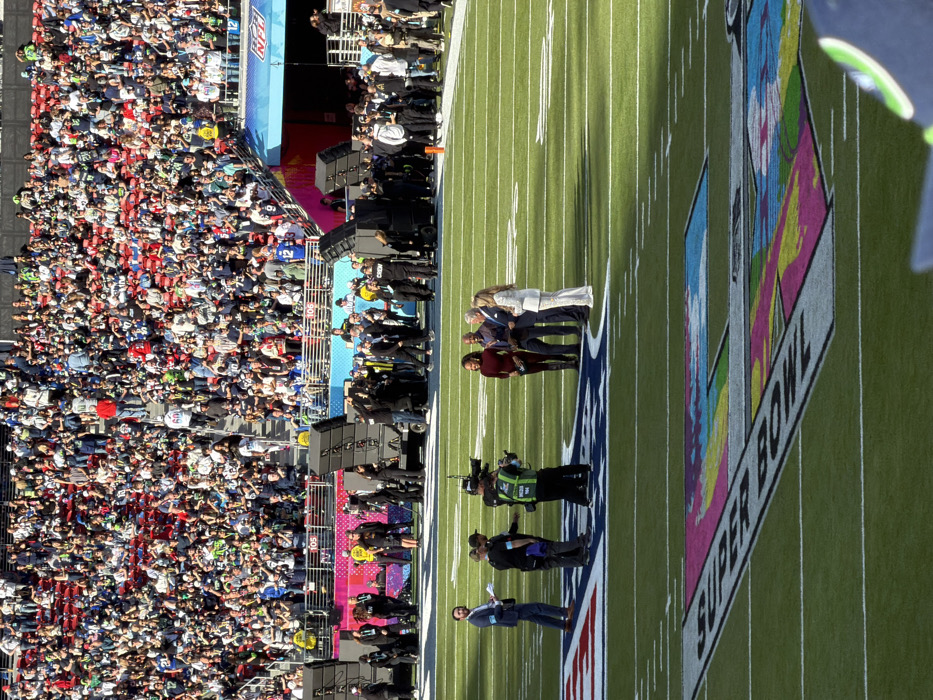 A large crowd of people fills the stands at a stadium. On the field, several people, including a group of four, stand near a large Super Bowl logo. Cameramen and other personnel are positioned nearby. The field has yard lines and markings. The stadium appears to be brightly lit.